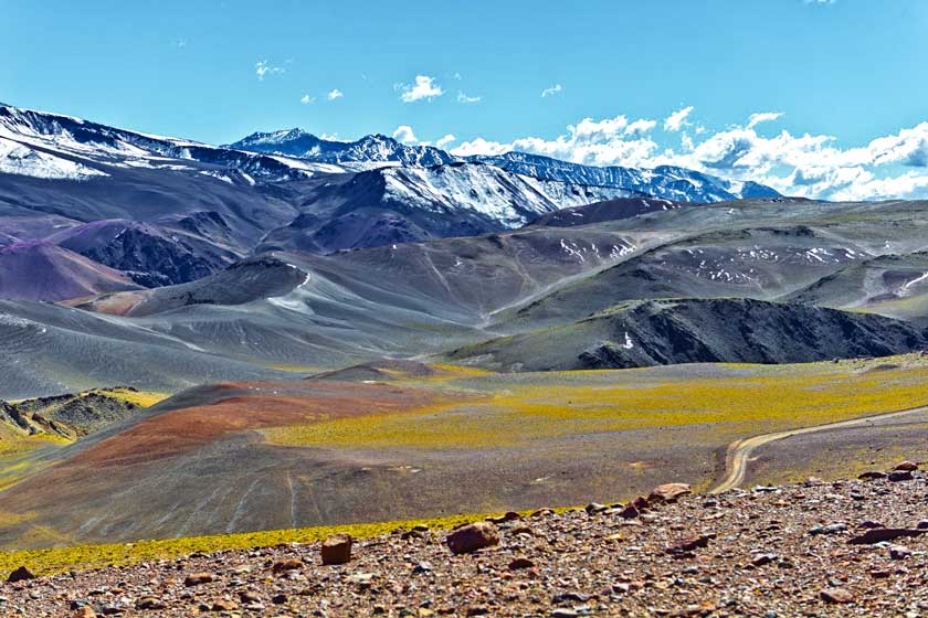 El sinuoso recorrido interna al viajero en la Cordillera de los Andes, hasta llegar a los 3.250 metros sobre el nivel del mar, donde se ubica el espejo de agua, a los pies del volcán Maipo (de 5.323 m).