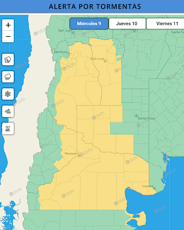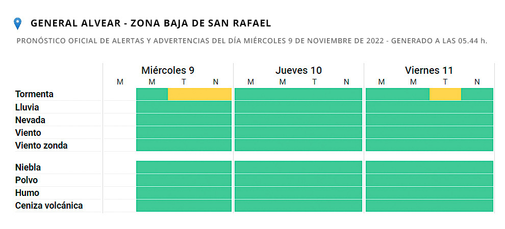 General Alvear y la zona baja de San Rafael, tienen el mismo nivel de alerta debido a que “el área será afectada por tormentas, algunas fuertes”, dice el pronóstico del Servicio Meteorológico Nacional.