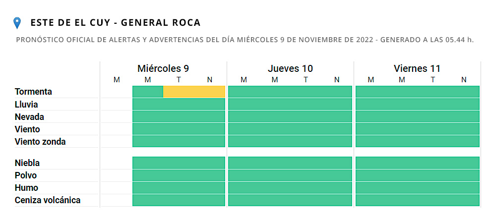 Para el Este de El Cuy y General Roca (en Río Negro), hay alerta amarilla por “tormentas aisladas, algunas localmente fuertes, con abundante caída de agua en cortos períodos, fuertes ráfagas, ocasional caída de granizo e intensa actividad eléctrica”. El pronóstico oficial detalla que “se esperan valores de precipitación acumulada entre 15 y 40 mm, pudiendo ser superados en forma puntual”.