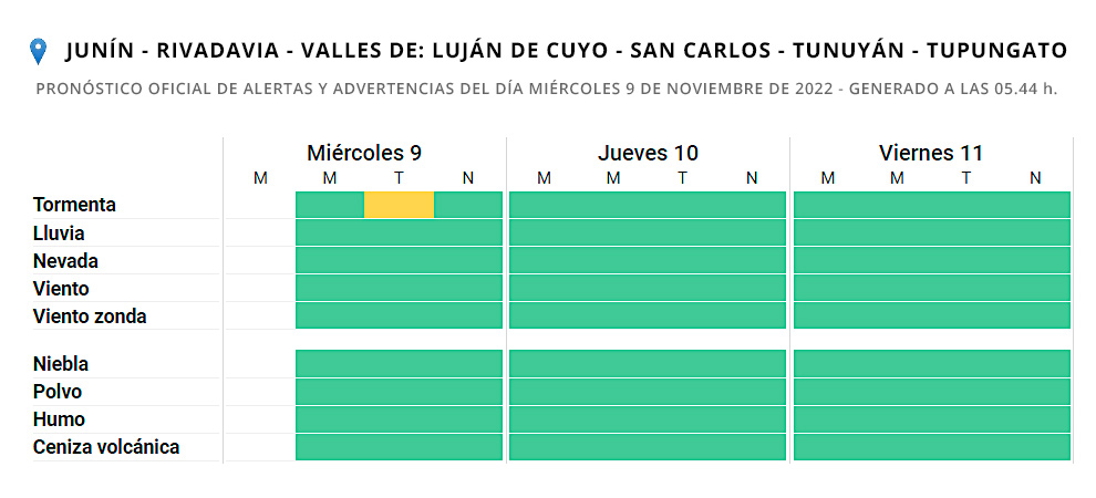 Con el mismo pronóstico (e igual nivel de alerta) están los Valles de San Carlos, de Tunuyán, de Tupungato y de Luján de Cuyo, y los departamentos Junín y Rivadavia (en el Este mendocino)