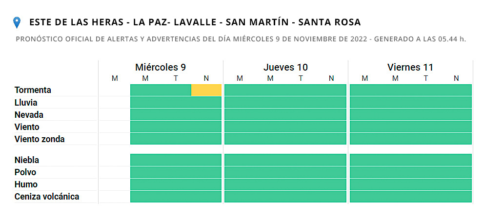 La Paz, Santa Rosa, San Martín, Lavalle y Este de Las Heras también están con alerta amarilla por afectación por tormentas, algunas fuertes; acompañadas por ráfagas y ocasional caída de granizo, importante actividad eléctrica y abundante caída de agua en cortos períodos, que podría fluctuar, como en los casos anteriores, entre 20 y 40 mm, aunque esos registros podrían ser superados localmente.