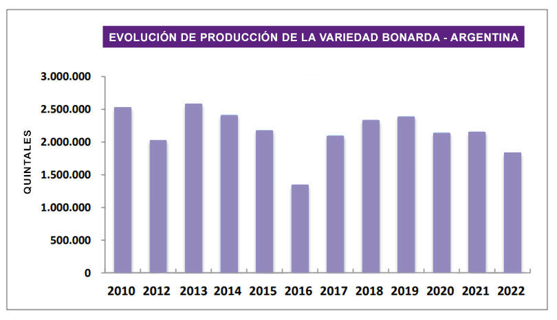 En 2022 la producción nacional de Bonarda fue de 1.816.353 quintales, lo cual representa el 9,4% de la cosecha total de uvas. Esta variedad ocupa el tercer puesto en el ranking de quintales cosechados, luego de Malbec y Cereza.
