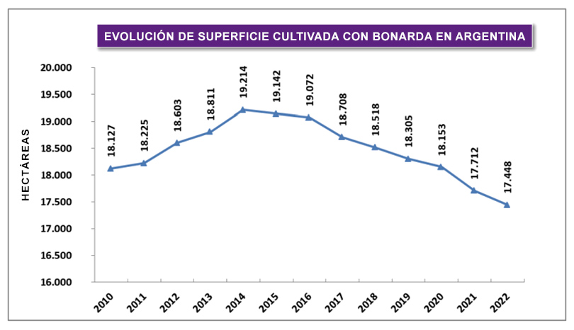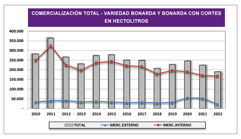 En el año 2022 se comercializaron 167.944 hl de vinos varietales elaborados con Bonarda. El 56% corresponde a varietal puro y el 44% a cortes con otra variedad.