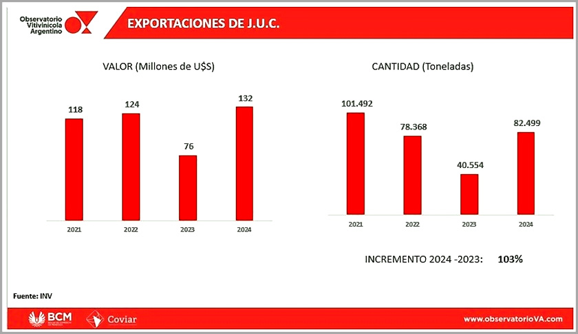 El que dio un gran salto fue el jugo concentrado de uva o mosto. Es que, en 2024, se exportó mosto argentino por un total de USD 132 millones, frente a los USD 76 millones de 2023. En volumen se vendieron al exterior 82.499 toneladas en 2024, más del doble que las 40.554 toneladas de 2023.