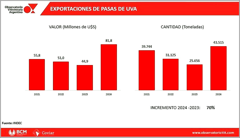 En valor se vendieron al exterior, en 2024, un total de USD 81,8 millones en pasas de uva, casi el doble de los USD 44,9 millones registrados en 2023.