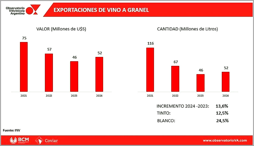 En cuanto al vino a granel exportado, entre 2023 y 2024 creció de USD 46 millones a USD 52 millones en valor y de 46 a 52 millones de litros, marcando un crecimiento del 13,6% interanual.
