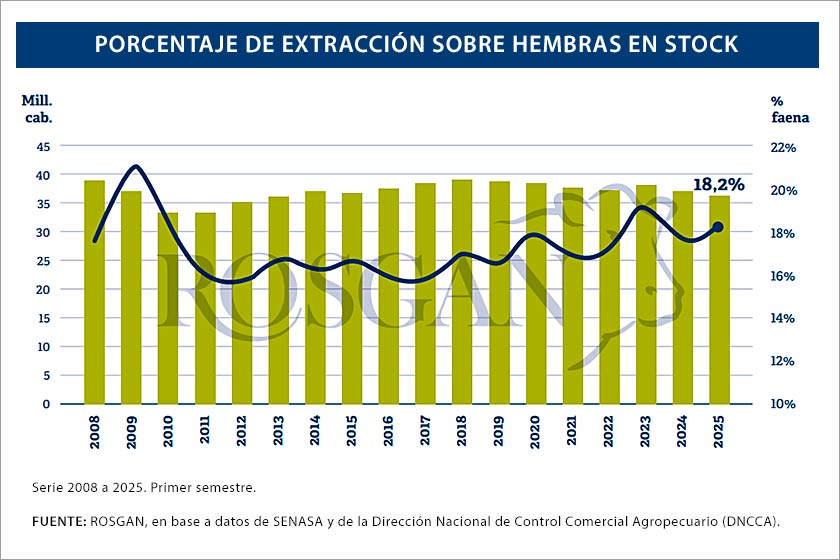 Al relacionar ese número con las existencias, destaca que «la faena del primer semestre de 2025 equivale al 18,2% del stock de vientres registrado al 31 de diciembre de 2024» . Recuerda que «un año atrás, este mismo indicador se ubicaba en 17,7%, y en 2023 alcanzaba el 19,2%».