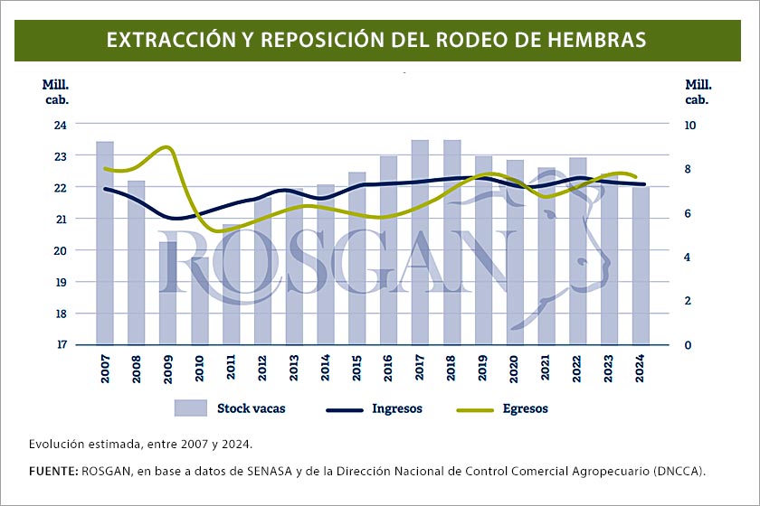 Tomando el año 2024, el ingreso de hembras al stock fue de 7,31 millones de cabezas, «dato que surge del recuento de terneras al 31 de diciembre de ese año», aclara.