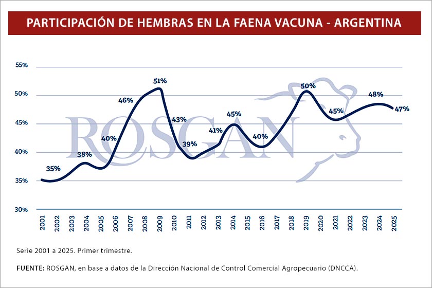 Recuerda que, excepto en 2021 -cuando cayó esa participación, forzada por las restricciones impuestas a la exportación- «desde 2019 hasta la fecha la faena de hembras ha oscilado entre el 47% y el 50% del total, lo que refleja un porcentaje considerable y sostenido» .