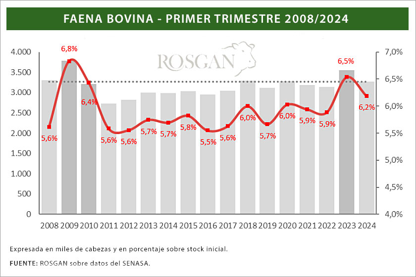 Pero, al analizar la cantidad de animales faenados en los primeros tres meses, «la caída se reduce al 8%, con 3,27 millones de animales este año versus 3,54 millones en 2023, siendo junto al 2023 una de las cifras más elevadas para el primer trimestre desde los máximos alcanzados en el periodo 2009-10″.