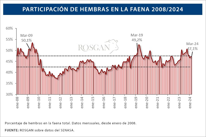 En conjunto, ambas categorías representan el 47,1% de la faena total del mes, la segunda participación más elevada para marzo, desde 2019 (49,2%) influenciado por una fuerte salida de vacas con destino a China.