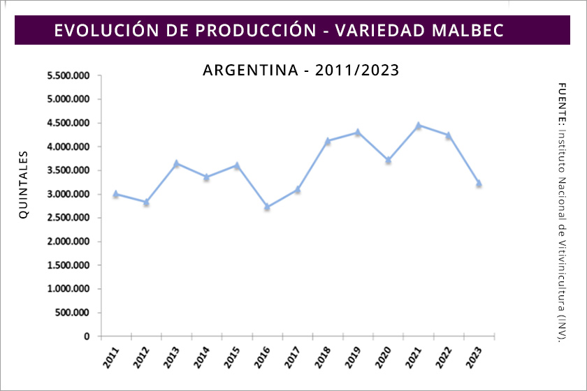 En 2023 la producción nacional de Malbec fue de 3.230.996 quintales, lo que la ubica como la variedad con mayor producción del país. Representa el 22,2% de la producción total de uva de Argentina.