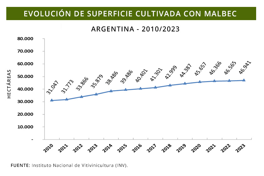 Presente en 17 provincias vitivinícolas de Argentina, el Malbec registró en el año 2023 un total de 46.941 ha cultivadas, lo cual representa el 22,9% del total de vid del país y el 41,5% de las variedades tintas aptas para elaboración de vinos y/o mostos.