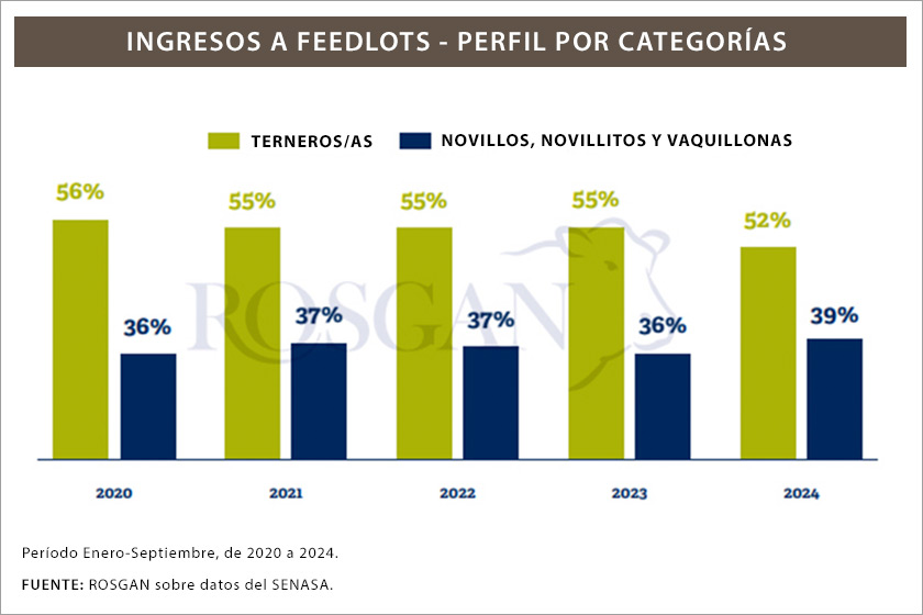 «Particularmente en el último año -subraya- esta tendencia de observa de manera más notoria, con un crecimiento en el ingreso de animales jóvenes del 36 al 39%, contra una disminución en terneros que pasa del 55% al 52% de los ingresos totales registrados durante estos primeros nueve meses del año».