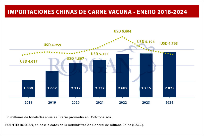 El informe remarca que «en 2024, China alcanzó un nuevo récord en volumen importado». Reportó «ingresos por un total de 2,875 millones de toneladas de carne vacuna» lo que representa «un 5% más que lo importado en 2023, y el máximo volumen hasta entonces registrado».