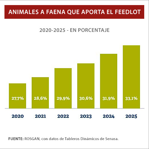 Al mismo tiempo, subraya que «los feedlots muestran una participación creciente en la oferta de animales destinados a faena» . Detalla que el año pasado aportaron «33% de la faena total, frente al 32% en 2024 y al 30,6% en 2023″.