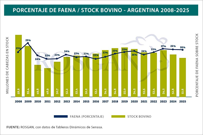 Detalla que, «considerando un stock inicial de 51,6 millones de cabezas, la tasa de extracción se ubicó por encima del 26%» . Admite que este indicador muestra una leve caída frente a los dos últimos ciclos, pero advierte que «permanece en niveles cercanos a los umbrales de equilibrio» .