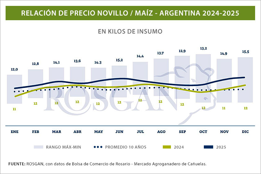 Según los cálculos de la analista del Rosgan, «en la actualidad, por cada kilo de animal terminado el feedlot puede reponer más de 15 kilos de grano, lo que representa una capacidad de compra superior al promedio histórico en más del 30%» .