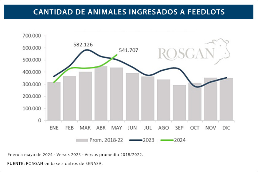 El reporte señala que, de acuerdo a los datos informados por el SENASA, en mayo creció unas 100.000 cabezas el número de vacunos ingresados a los feedlots, hasta alcanzar los 541.707 según los DTe, lo que representa de un incremento de 20% aproximadamente, respecto de los registrados de abril.