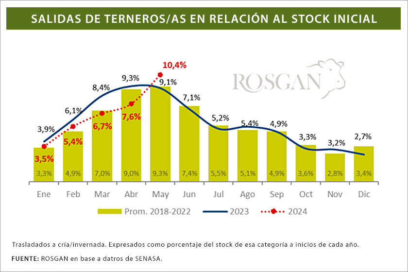 En efecto, medido sobre los cerca de 14,7 millones de terneros y terneras registrados en stock al 31 de diciembre de 2023, la salida de mayo refleja una tasa del 10,4%, una de las más elevadas para ese mes en los últimos años.