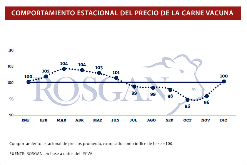 Señala en ese sentido que, al analizar la serie histórica de la relación con el precio promedio mensual para cada año (expresado como índice base 100), surge que «los mayores incrementos se concentran en el primer semestre» .
