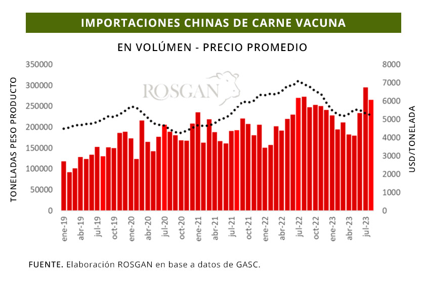 El reporte del ROSGAN, que coordina la analista María Julia Aiassa, pone sobre relieve el dato recientemente publicado por la Aduana china, que da cuenta de otro volumen relevante importado en agosto (casi 270.000 t de carne), «apenas 10% menos que en julio de este año cuando marcó su récord histórico».