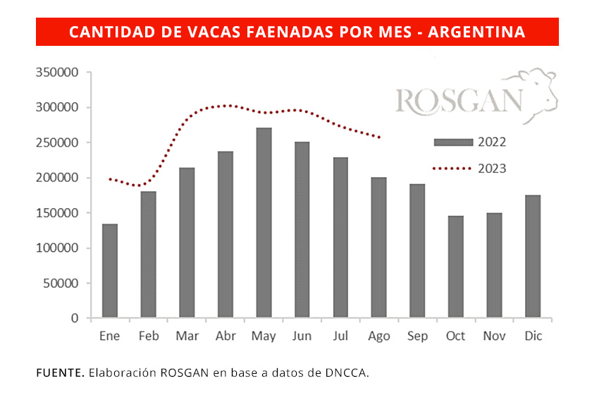 Mientras tanto, Argentina sigue faenando un elevado número de vacas. En agosto, y pese a una ligera desaceleración, seguía mostrando un incremento del 28% respecto de un año atrás, con casi 260.000 vacas faenadas.