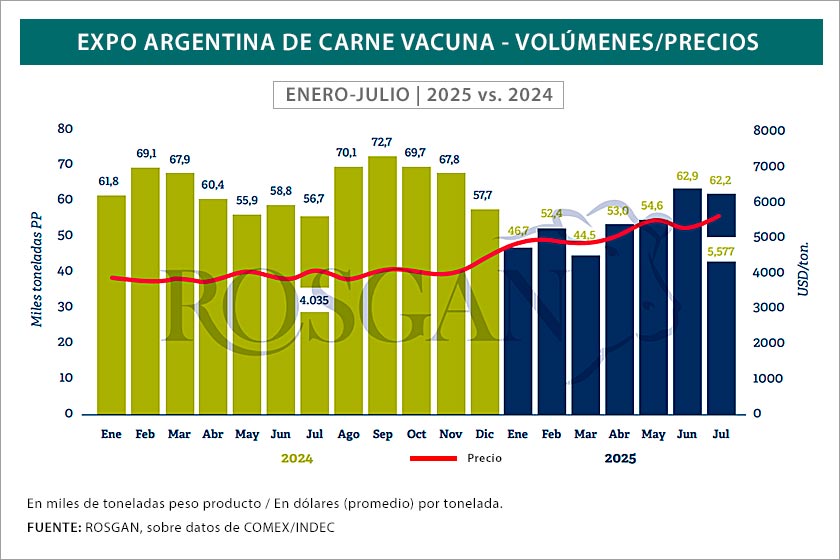 LOS PRECIOS. En el acumulado enero-julio de 2025 el precio promedio de la tonelada de carne vacuna argentina embarcada se situó en USD 5.165, lo que representa un incremento de 35% sobre el precio promedio logrado en los primeros siete meses del año pasado.