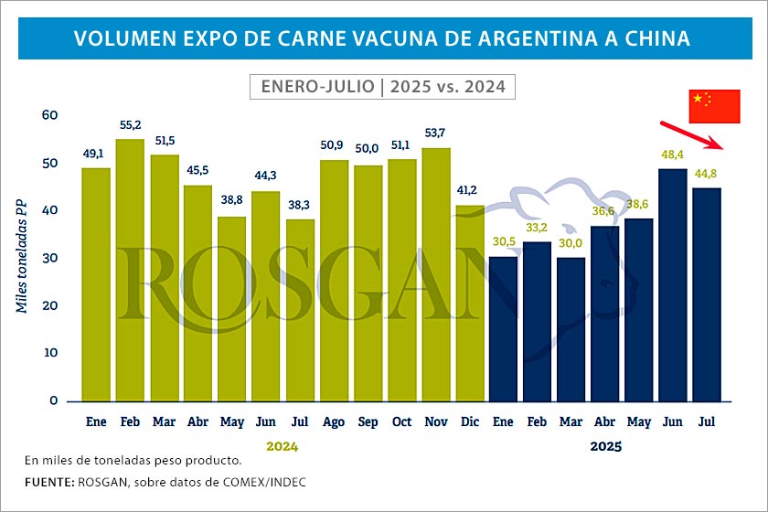 LAS VENTAS de carne argentina a China cayeron 7% en julio respecto del mes previo, y el retroceso parece haber seguido en agosto. Hacia ese mercado -que, dicho sea de paso, tiene mucha carne almacenada- apunta Brasil, para derivar los esperables excedentes que tendrá por la vigencia de aranceles adicionales que le impuso Estados Unidos.