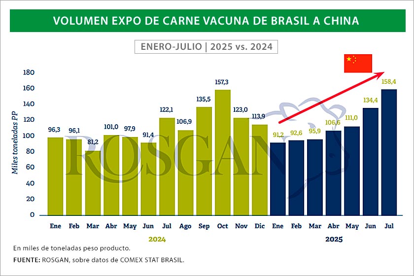Es que, ya en julio, al que considera un mes de transición hacia el aumento de esos aranceles «los embarques de carne vacuna desde Brasil hacia China reflejan un salto del 18% en volumen» respecto del mes anterior (junio 2025).