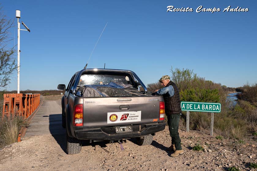 APRONTES. A punto de emprender camino -hacia el Oeste- el ingeniero Mariano Amuchástegui (del Cluster Ganadero de Mendoza) verifica que la carga esté segura… porque nos esperan 50 km muy difíciles de transitar hasta llegar a «La Marina».