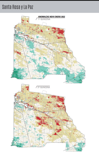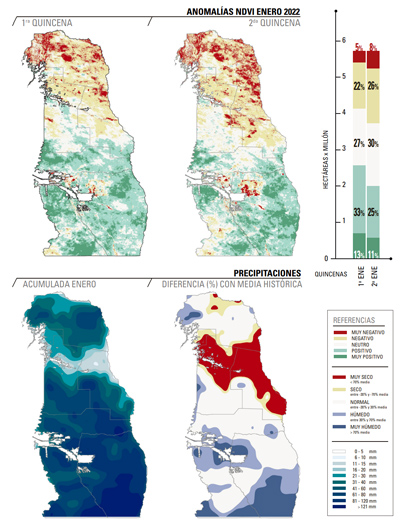 Las “manchas” en amarillo de la imagen (anomalía negativa) se expandieron casi 50% en la segunda quincena de enero respecto de la primera mitad del mes; mientras que las rojas, se duplicaron (y un poco más) entre una quincena y otra. Aunque es cierto que, en promedio, las áreas muy comprometidas representarían apenas el 5% del territorio.