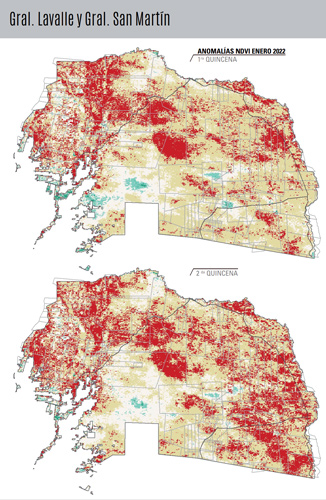 MENDOZA NORTE. La imagen muestra las Anomalías NDVI registradas en esa zona durante enero 2022. Las capturas satelitales, en este caso, cubrieron aproximadamente 1,1 millones de hectáreas. INFOGRAFÍA/EEA INTA Rama Caída.