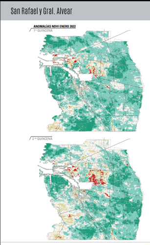 MENDOZA SUR. Anomalías NDVI registradas en el secano de San Rafael y General Alvear durante enero 2022. Los especialistas del INTA interpretaron, en este caso, las imágenes satelitales que cubrieron alrededor de 2,8 millones de hectáreas. INFOGRAFÍA/EEA INTA Rama Caída.