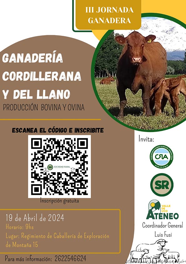«Ganadería Cordillerana y del Llano – Producción Bovina y Ovina» es el tema convocante de este encuentro que tendrá lugar el viernes 19 de abril, desde las 9 de la mañana, en instalaciones del Regimiento de Caballería de Exploración de Montaña 15, sito en Campo Los Andes, Tunuyán.