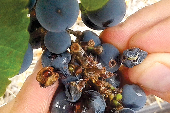 LAS LARVAS, al alimentarse de las flores o de los granos, causan el daño. La primera generación de la temporada ataca a los grupos de flores (inflorescencias). Además, los cubre con hilos de seda. Las restantes generaciones provocan daños en las uvas en formación y en los frutos ya desarrollados. FOTO/GENTILEZA Iscamen.