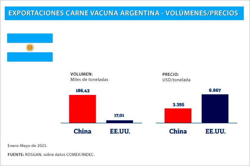 De allí surge que «el precio promedio de los cortes que ingresan bajo cuota a Estados Unidos ronda los USD 10.400 por tonelada, mientras que los sets de corte destinados a China promedian entre USD 5.000 y USD 6.000 por tonelada».