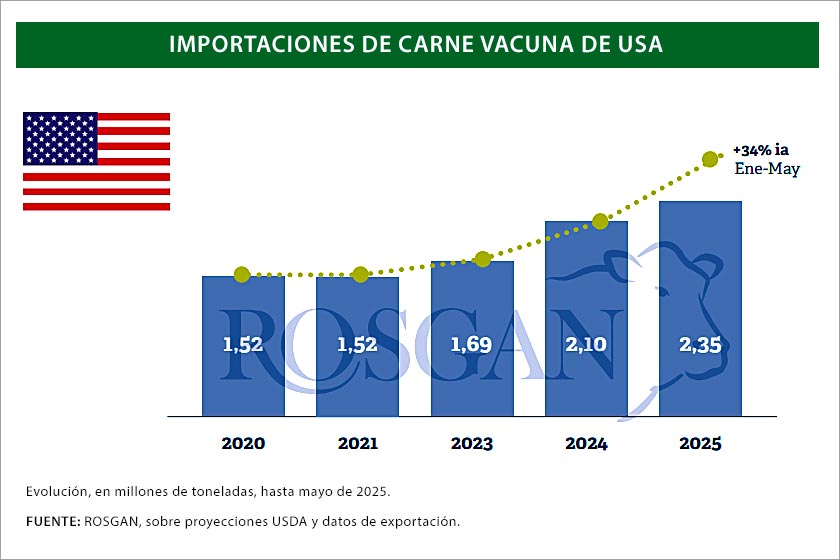 La analista del ROSGAN cambia el enfoque, situándose del otro lado del mostrador. En ese sentido, señala que Estados Unidos, que tenía una proyección inicial de 2,2 M de toneladas de importación para este año (5% más que en 2024) aumentó su ritmo de compras en los primeros meses, superando esa estimación.