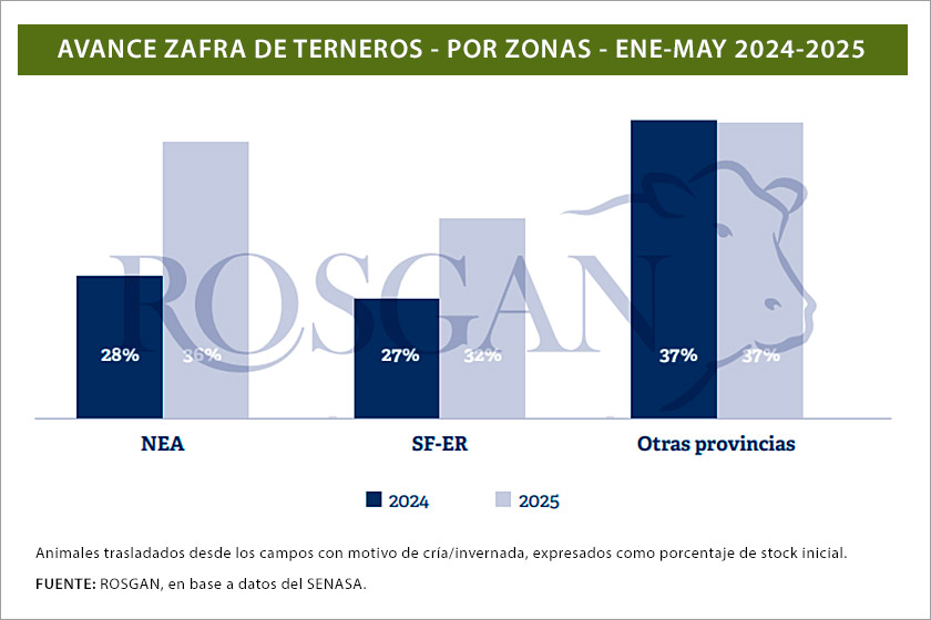 Del mismo modo, las provincias de Entre Ríos y Santa Fe (a las que la analista agrupa en la zona litoral), movieron en conjunto casi 890.000 terneros en lo que va del año, unos 160 mil más que en 2024, marcando en promedio un avance de zafra del 32%, frente al 27% registrado a igual fecha del año pasado.