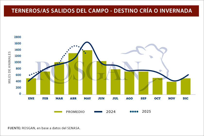 En ese sentido, detalla que la cantidad de terneros enviados a otros campos creció un 8% en lo que va de la zafra 2025 respecto los primeros cinco meses del año pasado. Los ingresados directamente a feedlots, en tanto, retrocedieron 6% interanual.