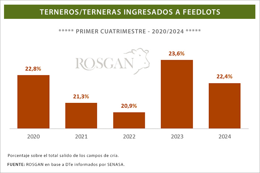 En lo que va del año, «de los 3,4 millones de terneros y terneras que salieron de los campos para continuar en sistema de cría o invernada, 759.000 (el 22,4%) ingresó a establecimientos de engorde a corral, apenas 1 punto más que el porcentaje registrado en año pasado donde el feedlot se posicionaba prácticamente como la única alternativa viable para la recría y engorde de esa hacienda».