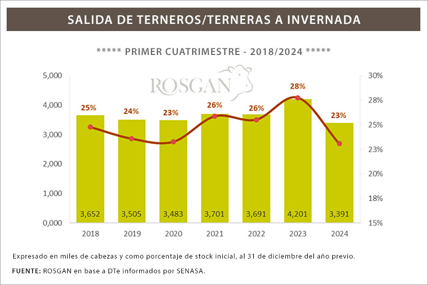 Remarca que «esta cifra, medida sobre el stock inicial informado para esta categoría al 31 de diciembre del año pasado, marca uno de los comienzos de zafra más lentos de los últimos años, con apenas un 23% de los terneros logrados durante el ciclo precedente, fuera de los campos».