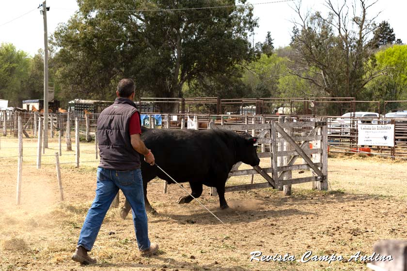 BIEN PLANTADO. El Angus negro PC de Payma -calificado como el Mejor Toro de la muestra- exhibió su muy buena conformación y agilidad en sus desplazamientos. Al salir de la pista, y con el satisfactorio resultado de la subasta, Matías Garmendia lo acompañó hasta los corrales, sabiendo que el replanteo productivo iniciado en los últimos cuatro años, está dando los resultados esperados. FOTOS / Revista Campo Andino & Agroindustria.