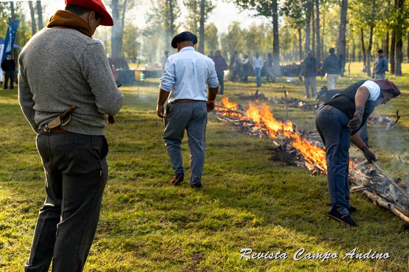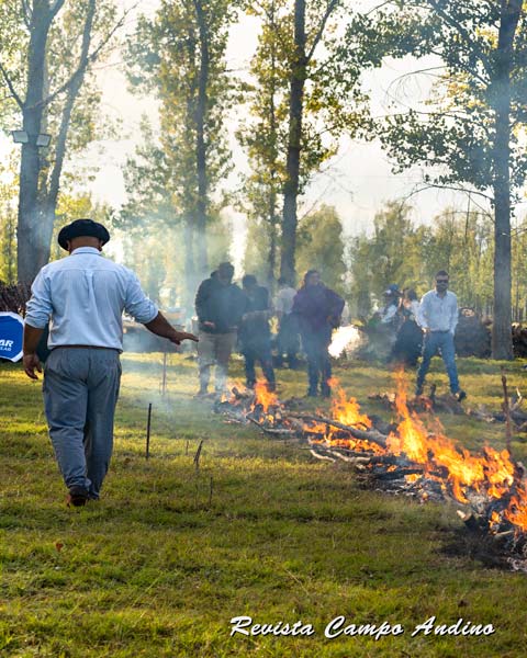 PURA EXPERIENCIA. También el jefe de los asadores apuntaba su mano hacia las llamas… pero para «tomar la temperatura» en el sector donde, un rato después, serían ubicados los costillares. FOTOS / Revista Campo Andino & Agroindustria.