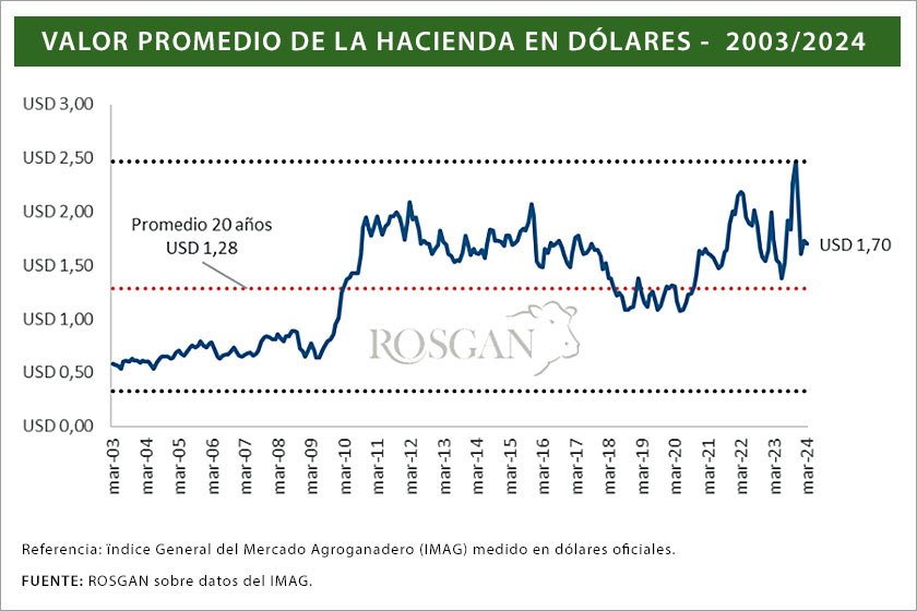 Apunta que «si bien en dólares los valores también vienen cayendo respecto de los máximos alcanzados en diciembre del año pasado, actualmente la referencia se ubica en torno a USD 1,70 como promedio ponderado de las distintas categorías, lo que equivale a más de un 30% por sobre el promedio de los últimos 20 años».