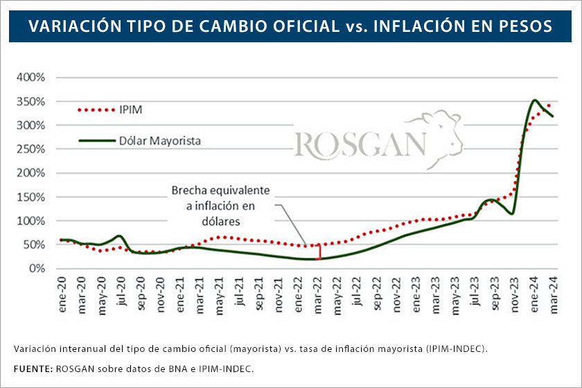 «En 2022, este comportamiento se repitió cerrando el período con una inflación en pesos del 95% y una devaluación del 70%». En 2023, «la corrección oficializada por el gobierno entrante en diciembre, logró revertir esta tendencia». Así, el año cerró con una «devaluación del tipo de cambio del 271% anual frente a una inflación en pesos trepando a niveles récord de 212% anual».