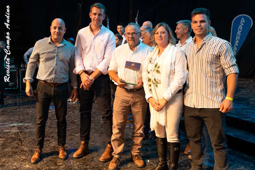 GABRIEL CORVALÁN (de El Rodeo) junto a su hijo Facundo y a Ivana Stefanazzi, recibió, de manos de directivos de la Cámara empresaria de General Alvear, el primer premio por su lote de vaquillonas Angus preñadas hechas en el establecimiento «La Marina», al Sur de ese Departamento mendocino, en el límite con La Pampa. FOTOS / Revista Campo Andino & Agroindustria.
