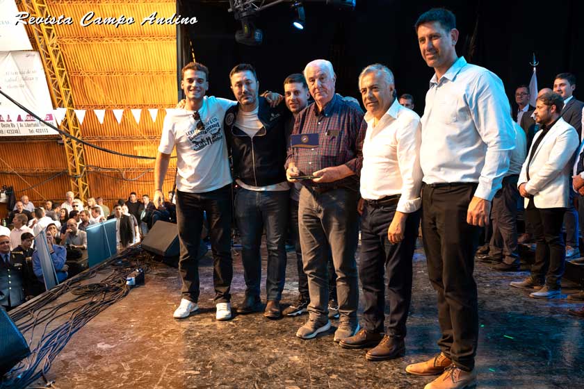 EDUARDO MONTOYA (de El Juncal) junto a sus nietos recibió, del ministro de Defensa de la Nación, Luis Petri -acompañado por el gobernador de Mendoza, Alfredo Cornejo, y el presidente de la Cámara de Alvear, Ramiro Labay- el premio mayor por su lote de vaquillonas Angus colorado de recría logradas en su establecimiento del Este mendocino.