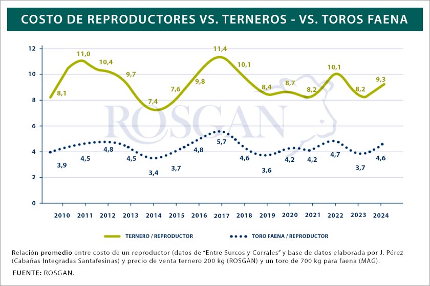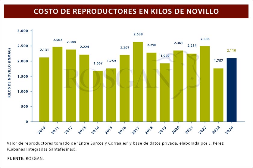 Precisa que «luego de las subas registradas en las últimas semanas -que posicionan al INMAG en torno a los $2.250 el kilo- el valor actual de los reproductores, a precio de hoy, termina ajustando a 1.700 kilos de novillo, considerando un rango de valores de 3,8 a 4,2 millones de pesos por reproductor» .