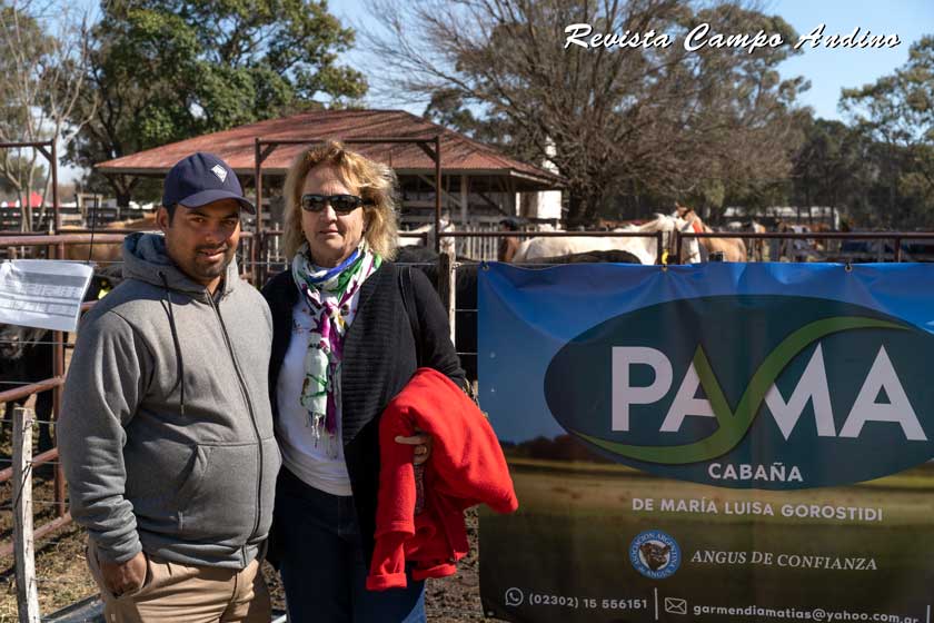 SEGUNDO MEJOR TRÍO. La distinción fue para un lote de Angus negro PC de Cabaña «Payma» (de Pellegrini, provincia de Buenos Aires). Su titular, María Luisa Gorostidi, y el encargado del día a día en el establecimiento, Víctor Segovia, valoraron el reconocimiento. FOTOS / Revista Campo Andino & Agroindustria.
